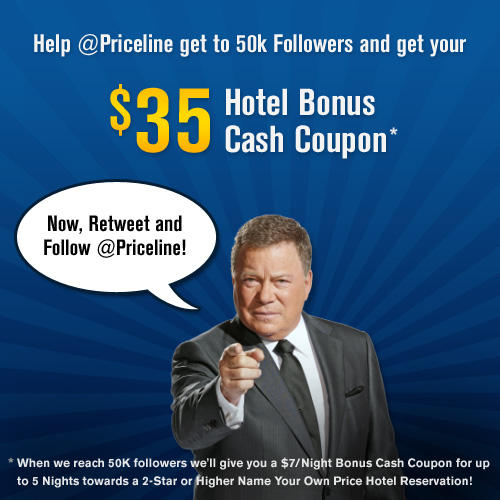 Priceline $50 "Name Your Own Price" Bonus Cash for FUTURE Booking When ... Book A Name Your Own Price® Hotel Room & Get $50 Towards A Future Hotel Stay! •When you book an eligible Name Your Own Price® hotel stay between Wednesday 9/22/10 - Sunday 10/31/10 you will receive a $50 Hotel Bonus Cash Coupon that can be used on a future Name Your Own Price® Hotel booking.