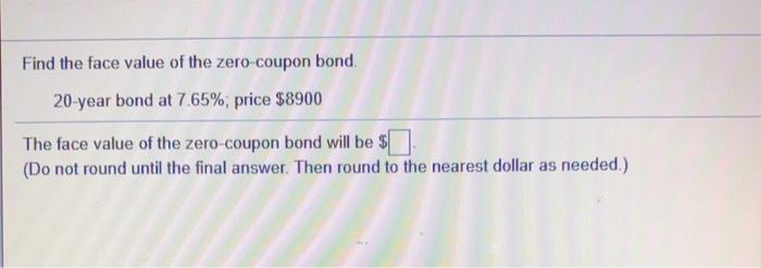 Solved Find the face value of the zero-coupon bond. | Chegg.com Question: Find the face value of the zero-coupon bond. 20-year bond at 5.95 %; price $9050 The face value of the zero-coupon bond will be $ ____. (Round to the nearest dollar as needed.) This problem has been solved! See the answer